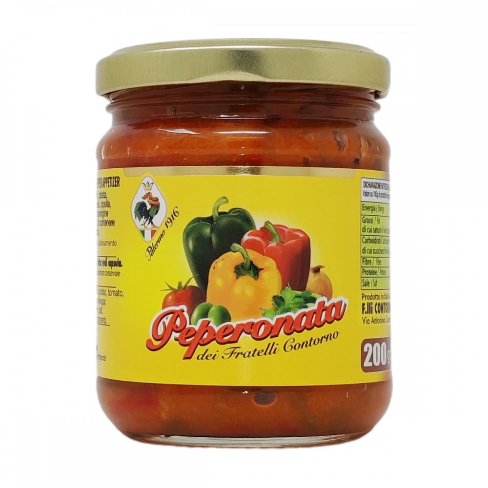 Peperoni (47,5%), patate, pomodoro, olio di semi di girasole, cipolla, zucchero, aceto di vino, olio extravergine di oliva, olive*, sedano, sale.